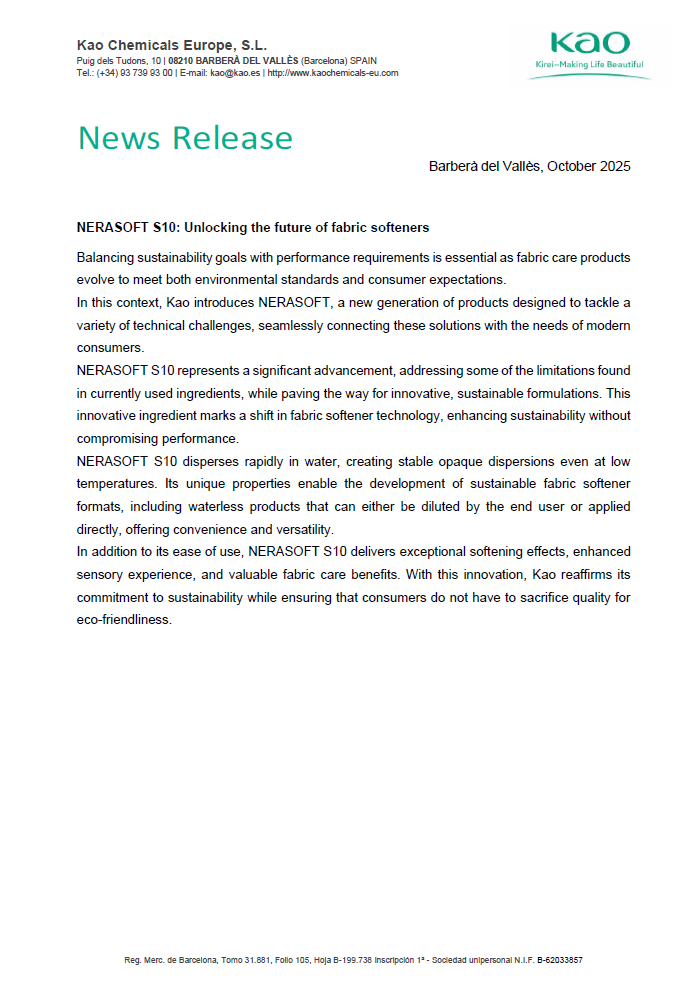 With rapid dispersion in water and excellent stability even at low temperatures, NERASOFT S10 supports the development of versatile, waterless softener formats that enhance convenience and reduce environmental impact. Delivering outstanding softening performance and sensory benefits, this breakthrough reaffirms Kao’s commitment to driving sustainable innovation in fabric care.